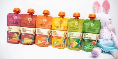 Peter Rabbit Organics offers 100% organic fruit and veggie pouches with no added sugar, salt, or artificial ingredients, designed for healthy snacking on the go.